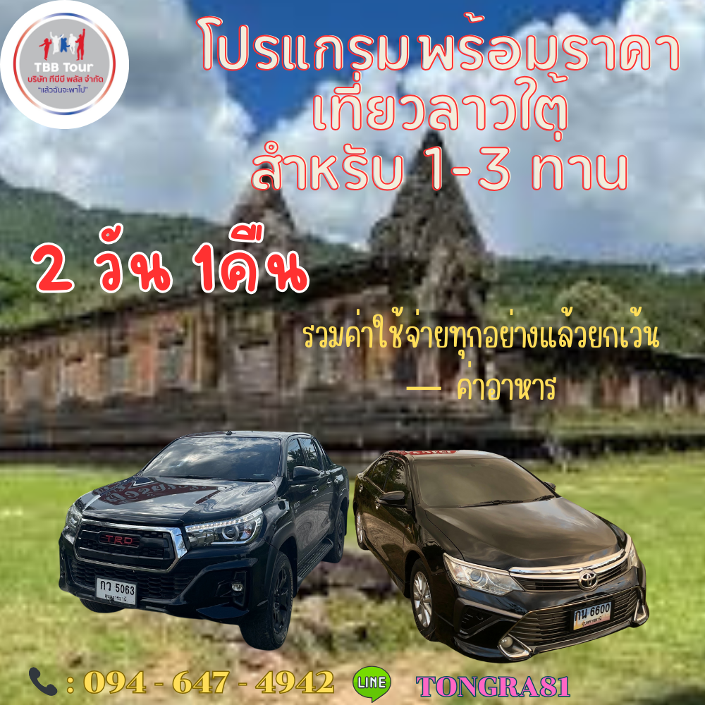 ทัวร์ลาวใต้ 2 วัน 1 คืน เริ่มจากอุบล เดินทางโดยรถเก๋ง รับ-ส่งที่ จ.อุบลราชธานี พร้อมเหรดราคา สำหรับ 1-3 ท่าน .